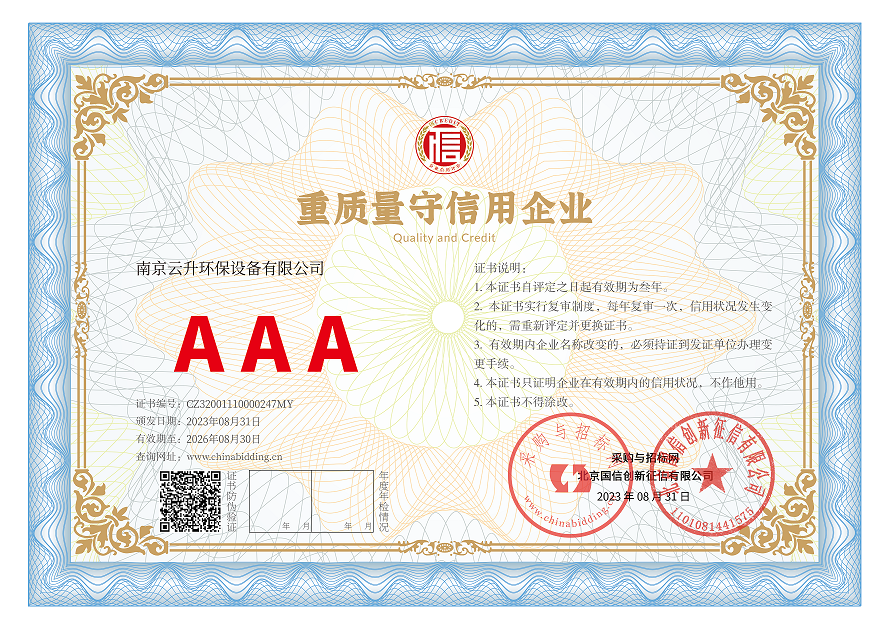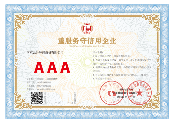 南京云升環(huán)保設備有限公司全體員工愿以環(huán)境保護為己任,以市場為導向,以優(yōu)質服務為原則,嚴格的管理、先進的生產(chǎn)工藝、至上的品質、完善的售前售后服務,與廣大新老用戶攜手并進,共鑄輝煌。公司已通過ISO9001:2000質量管理體系標準認證,成為江蘇省高新企業(yè),并進行不斷的技術改進和創(chuàng)新,為客戶和合作伙伴提供滿意的產(chǎn)品。